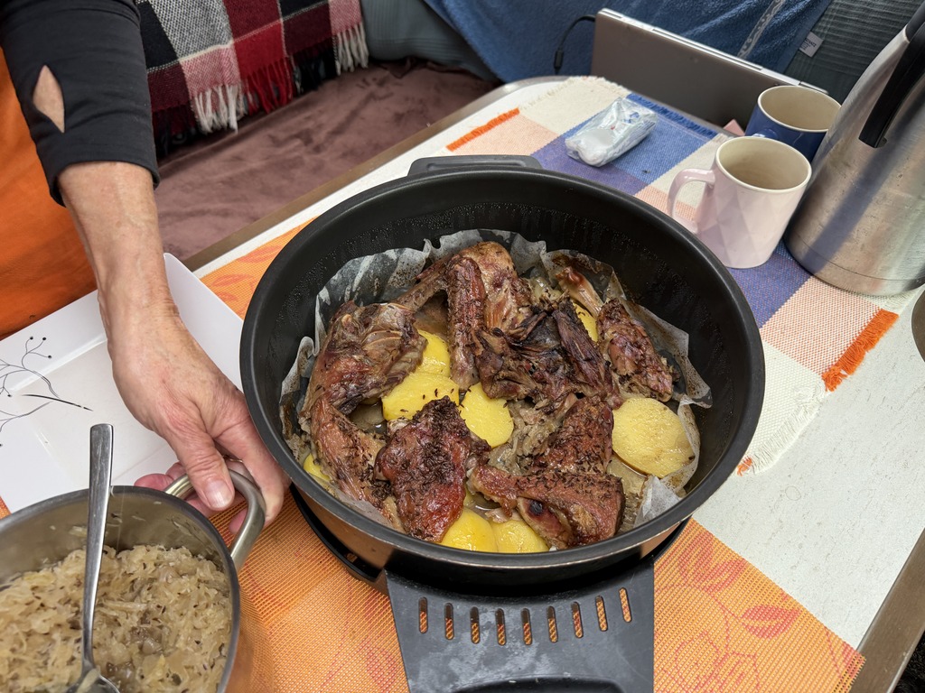 Mám s sebou zásoby ještě z domova a dneska jsem zalovila v mrazáku, teda vlastně včera večer, a vytáhla balíček s půlkou kachny a půlkou kuřete.