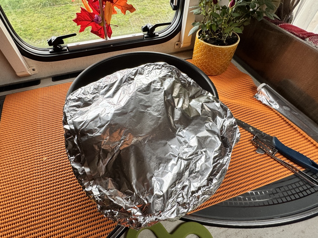 Brambory a cibule jde pod kačenu. Tu řádně posolím a hlavně pokmínuji. Klasika. Nic víc. Pokud chci něco hodně propéct, což v případě kačenky ano, tak si vyrobím takovou alobalovou pukličku,