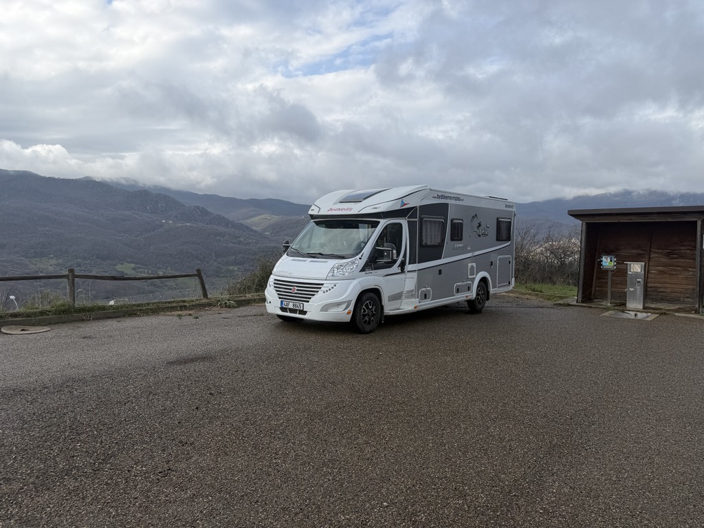 Stojíme na pěkném místě za vesnicí, které je sice poněkud nakloněné, ale tiché a příjemný s výhledem na protější kopce.