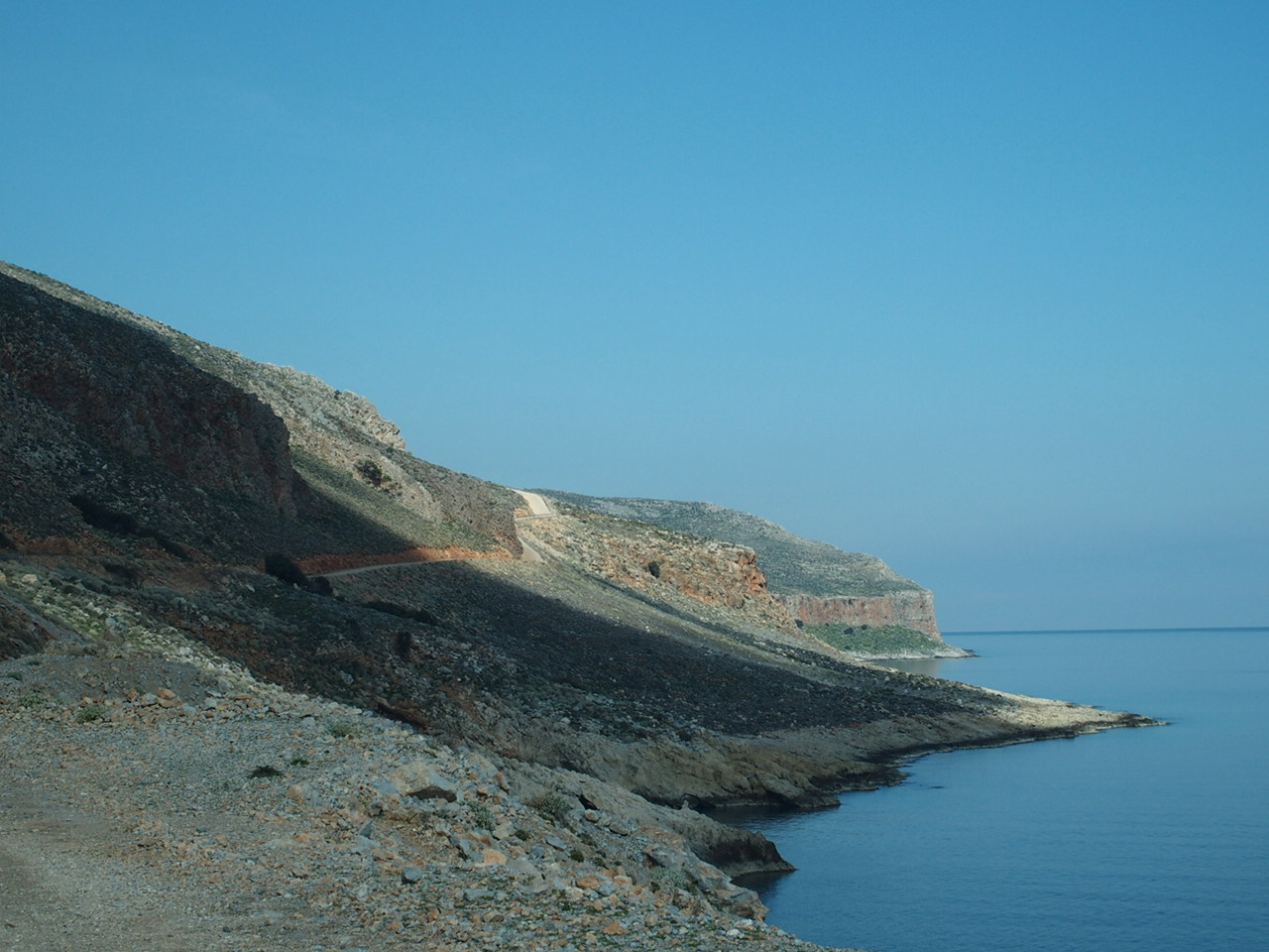 Přes zátoku vidíme takovou, z dálky, kozí stezku, která se vine podél pohoří někam do dáli. Tiše doufám, že to není ta naše cesta, ale v navigaci jasně vidíme, že by to měla být ona, ale jak víme, i navigace je občas dost zmatená a možná cesta vede za kopcem. No, nevede a skutečně si to suneme po silnici, kterou jsme z dálky viděli.