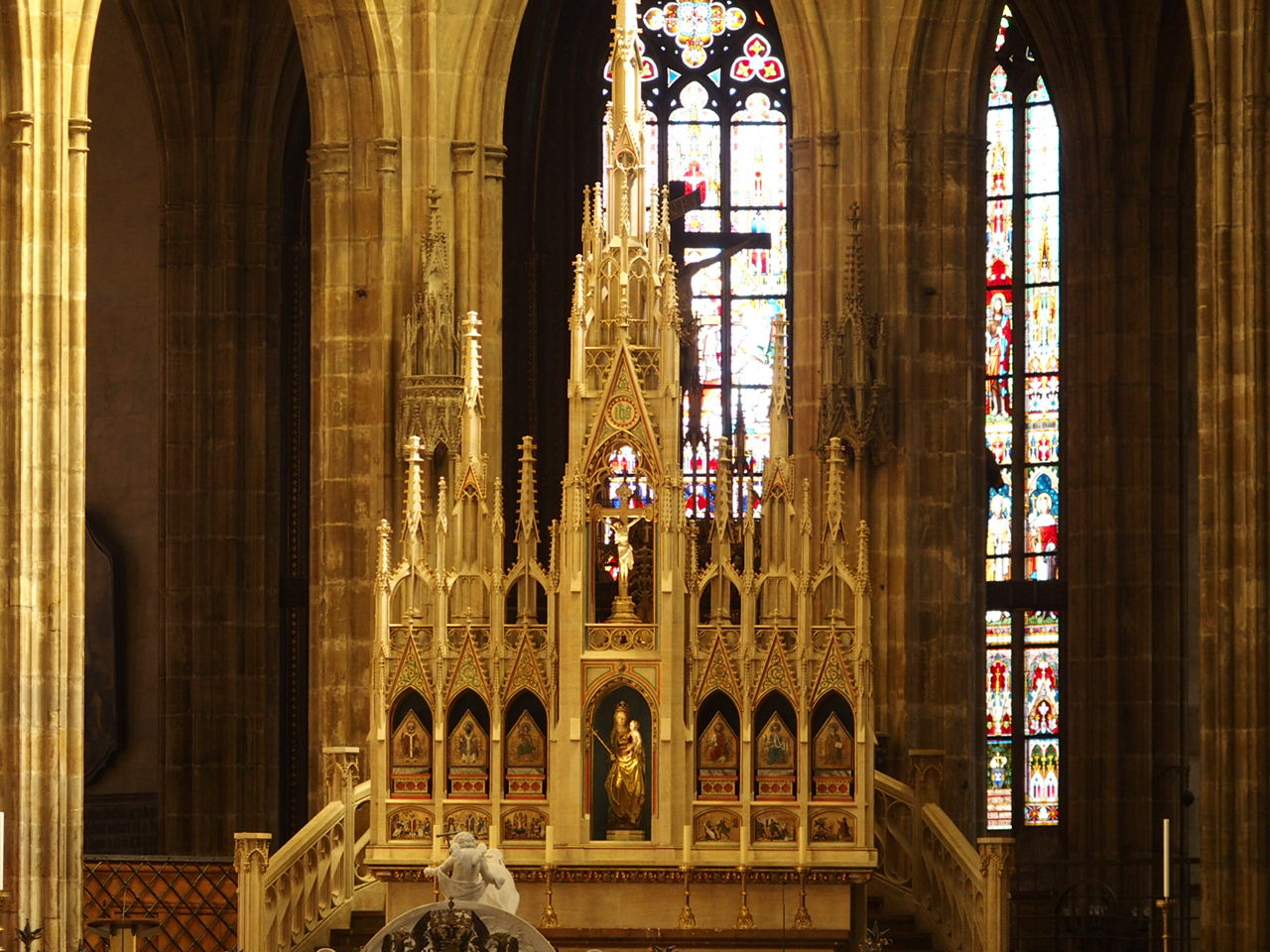 My obdivujeme překrásnou mozaikovou vitráž v oknech. Výjevy Poslední soud, postavy českých patronů, císaře Karla IV a jeho manželky Elišky Pomořanské nás přivádějí v úžas.