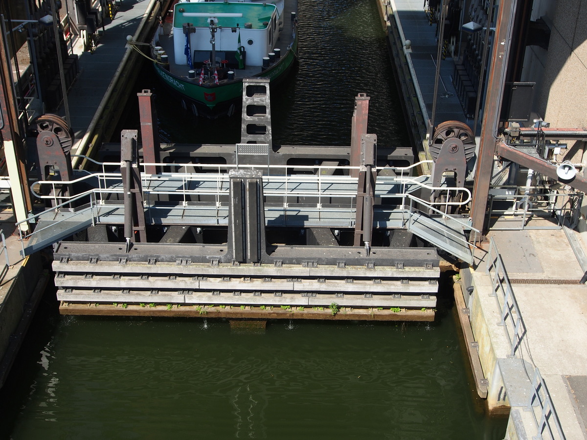 Centrální sloupec vody působí jako píst ve svislém válci. Mohutný ventil se střídavě otevírá a uzavírá podle toho, kolik vody bylo vytlačeno lodí vjíždějící do komory.