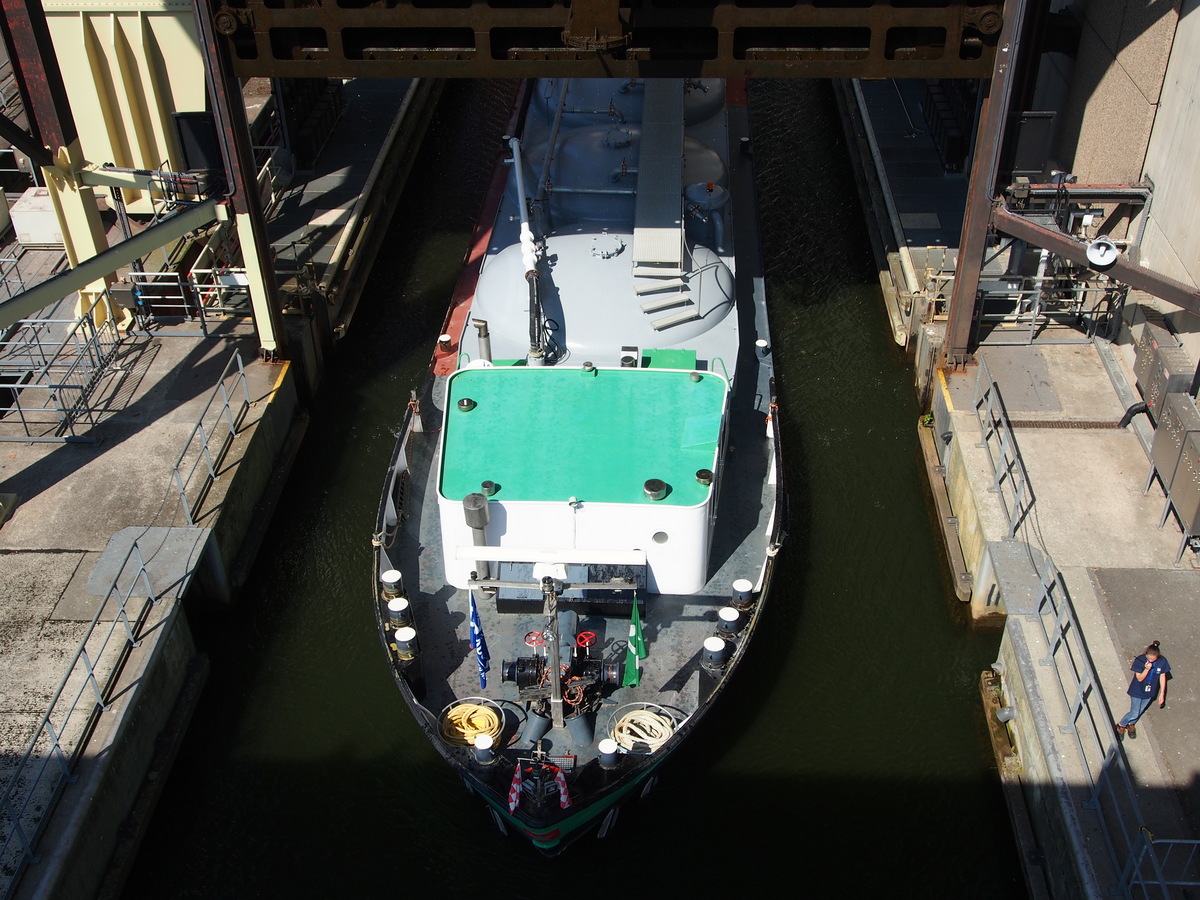 Přijeli jsme seshora a akorát jsme viděli najíždět loď, která byla na řadě a než jsme sjeli dolů na ochoz výtahu, loď už se poklidně, pomalinku spouštěla k nám dolů.