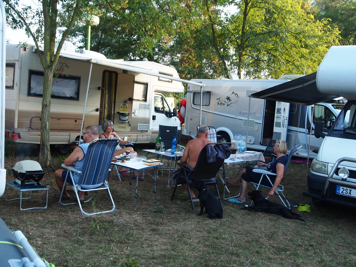 Přesouváme se do Týnce nad Labem, kde je jednak kemp, kde se samozřejmě dá stát, ale po uhrazení všech možných poplatků, nicméně my stojíme na louce, která je za kempem a bez zákazových cedulek.