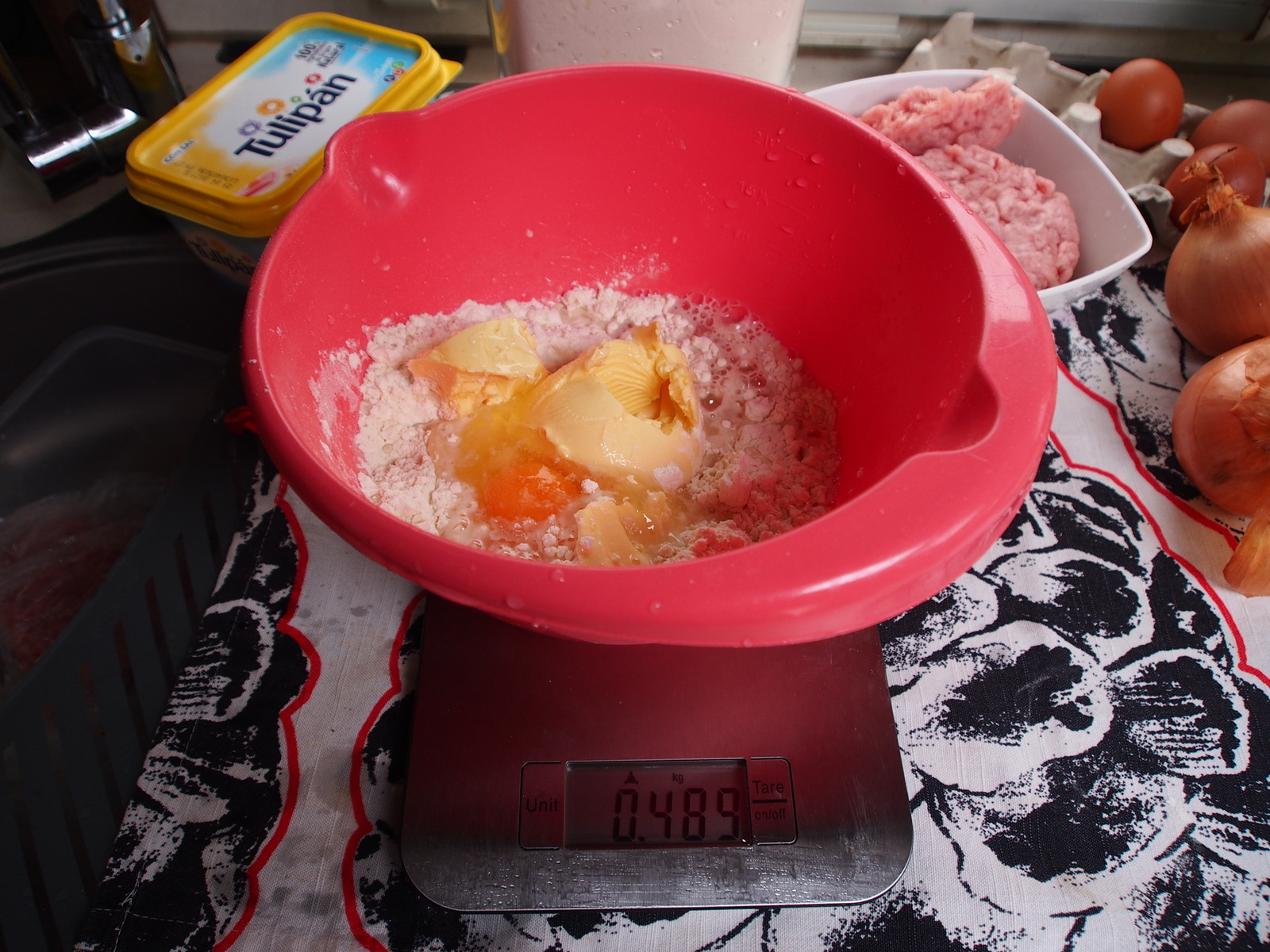 Potřebujeme na těsto 250 g hladké mouky + 150 g másla + jedno vejce + 3 lžíce studené vody + špetka soli.