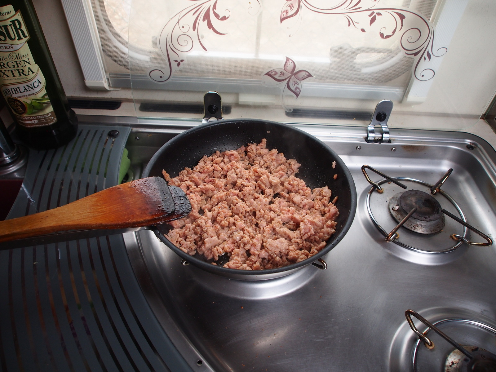 V pánvi osmahneme a rozklofeme lopatkou mleté maso a ochutíme grilovacím kořením.