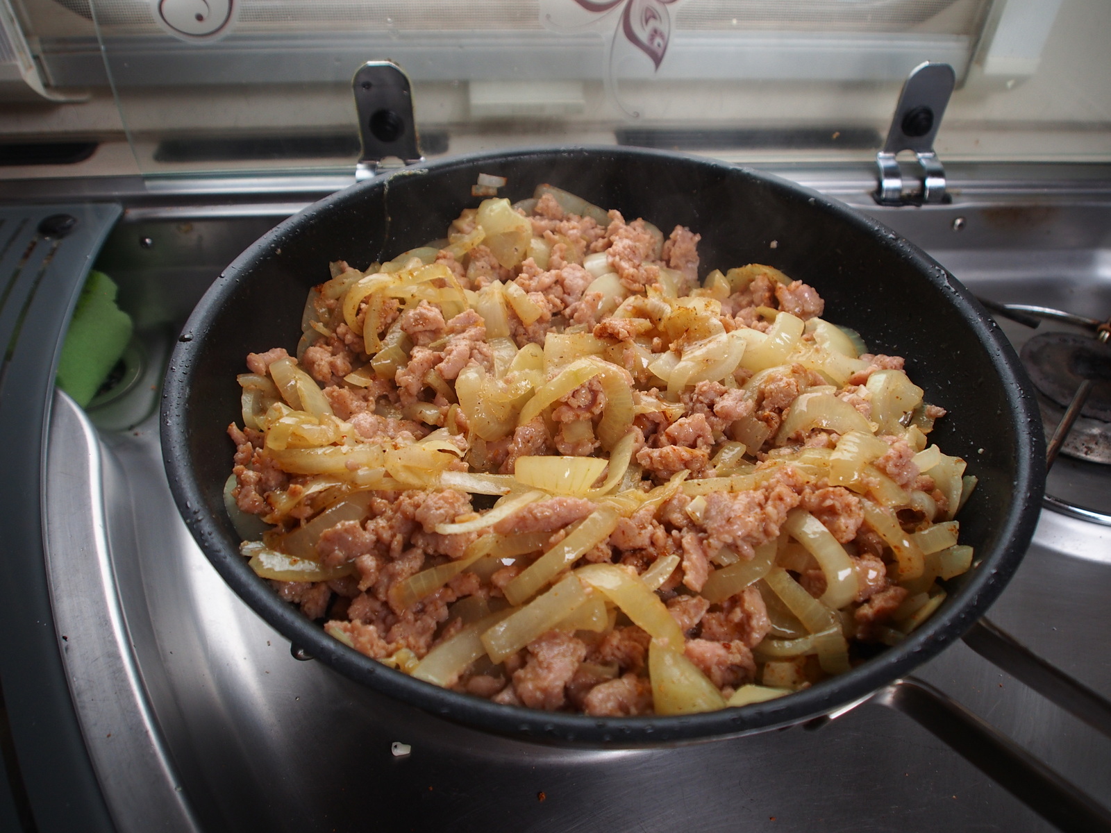 Použijeme mísu z těsta, vysypeme z pánve mleté a usmažíme cibuli nakrájenou na půlkolečka, tu osmahneme, vysypeme do mísy a promícháme s masem.