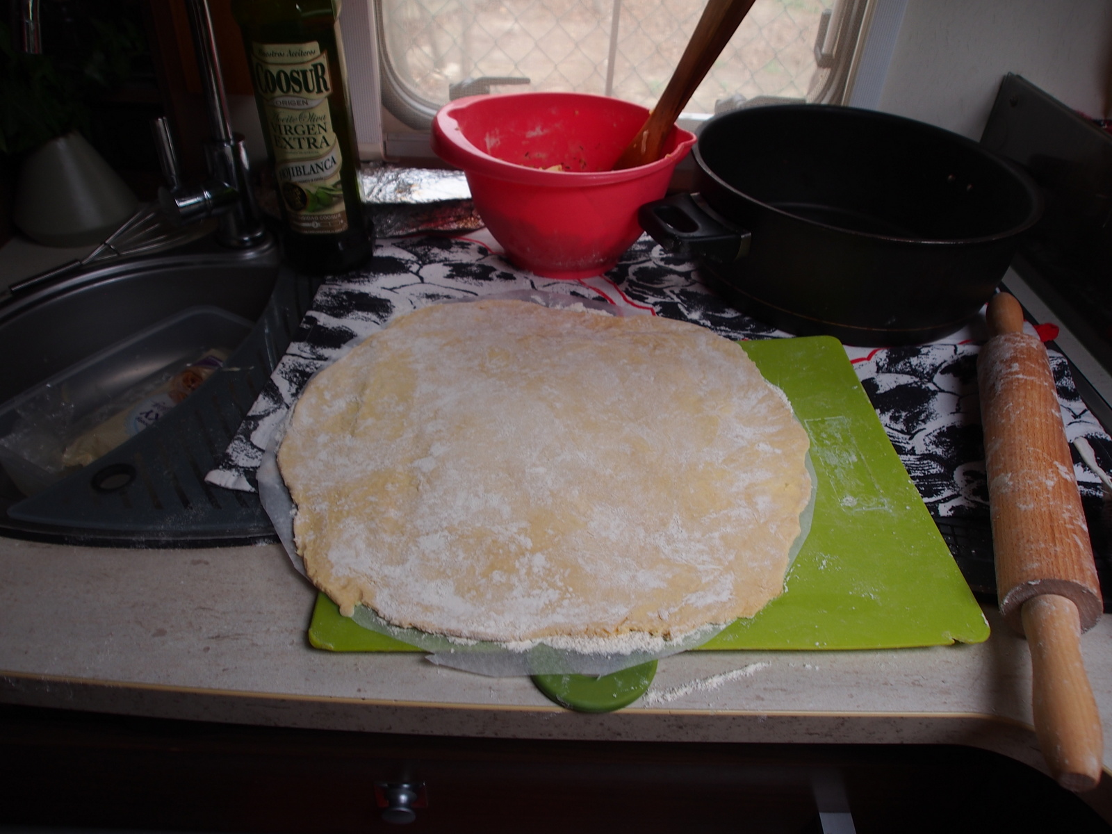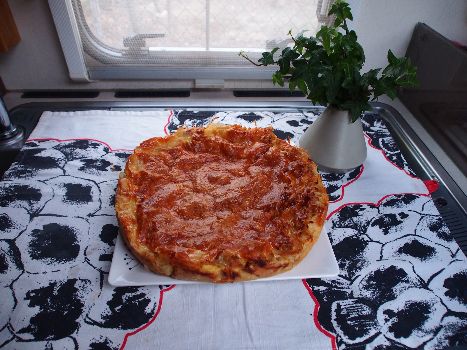 Náplň: uzené maso na kostičky nakrájené nebo kuřecí maso nebo mleté maso + 3 – 4 velké cibule + 3 – 4 vejce + 250 ml mléka nebo smetany + špetka soli + strouhaný sýr 100 gr do směsi a pak dalších 100 gr na posyp a důležitý je tymián, lžička nejlépe čerstvého, ale já mám sušený, tak jsem ho na chvíli nasypala do mléka, hezky se rozvoní + olej + grilovací koření + sůl, pepř + olej