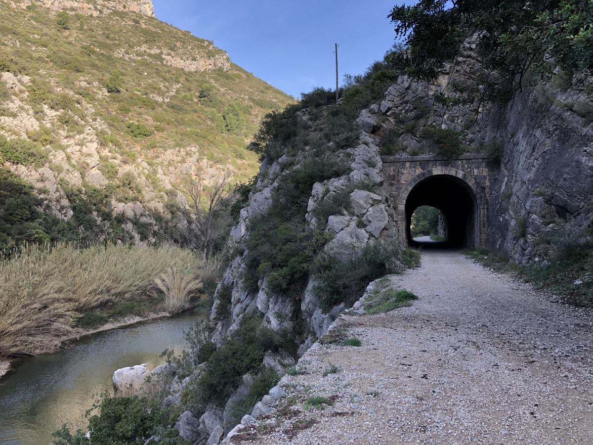 Jedeme po budoucí Greenway , která využívá staré trasy vlaku z městečka Alcoy do Gandía. Železniční trasa byla uzavřena v roce 1969.