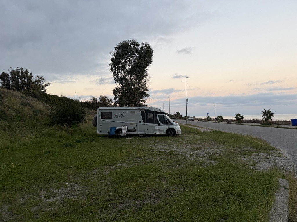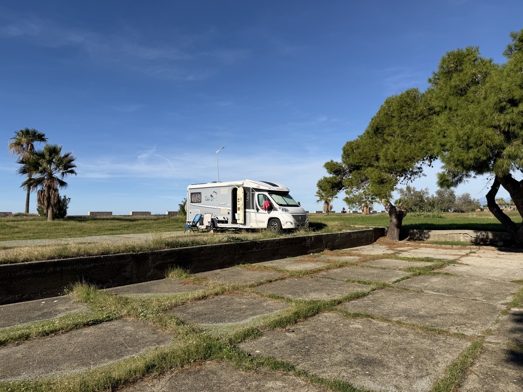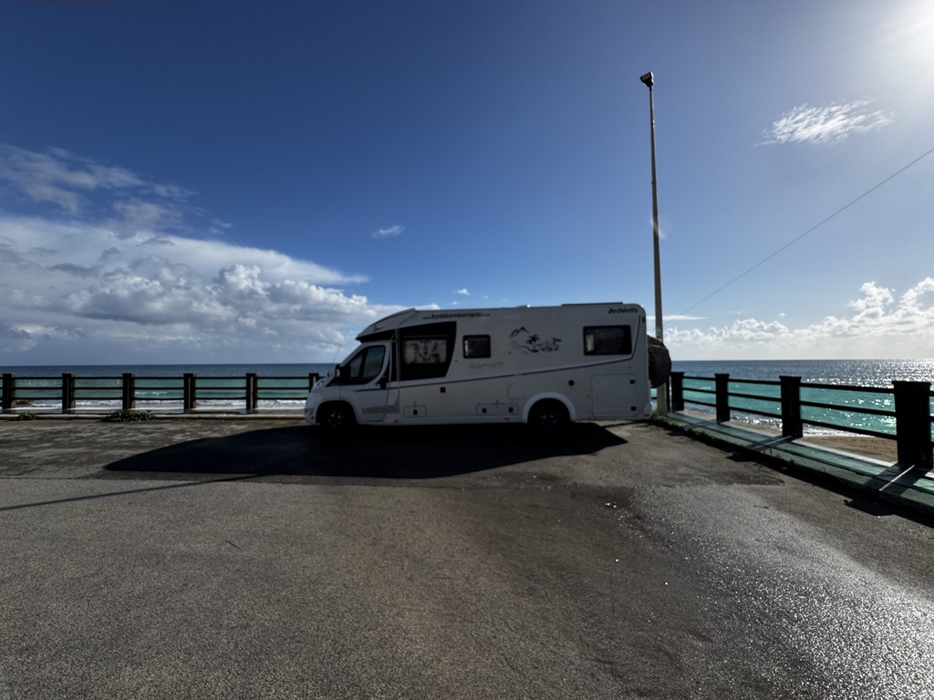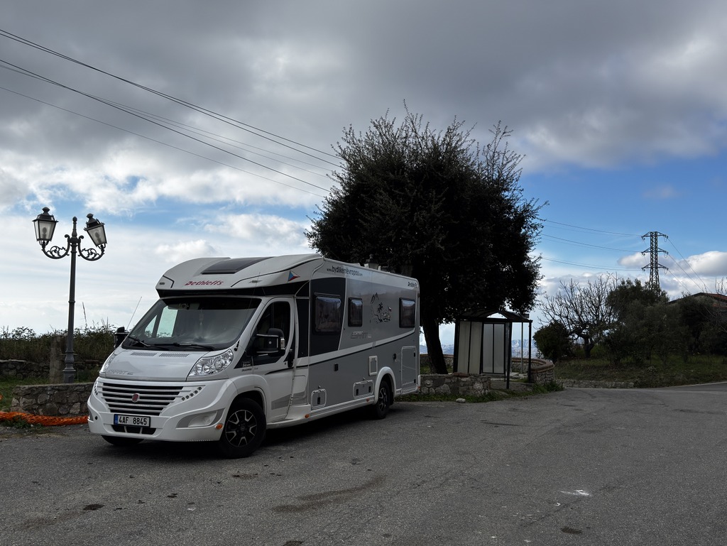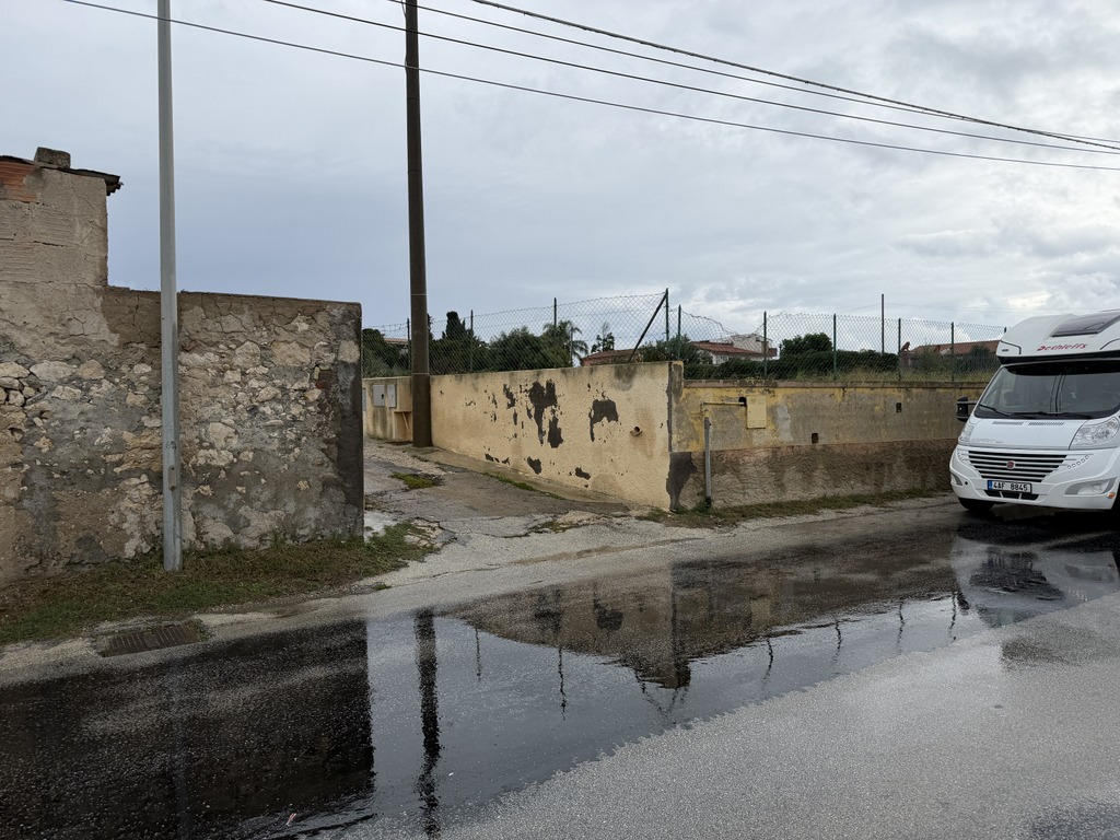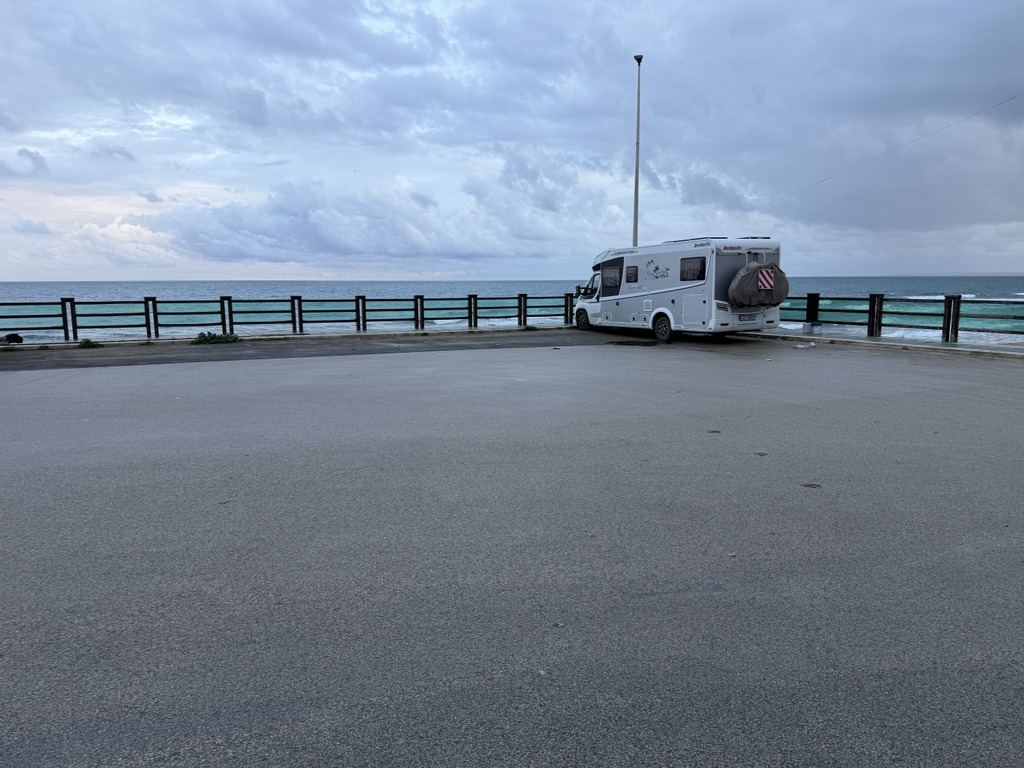 Stojíme na klasickém parkovišti v Agropoli hned u kanálu, který stahuje vodu z hor nad námi. První, co jsem koukala, jak jsme vysoko nad potůčkem, který se umí změnit v dravou řeku během jedné noci. Na to bych upozornila při stání na divoko pod horami u malého potůčku. U nás ani nemusí pršet, ale prší v horách a k nám se to vše přižene. Během pár hodin se může zvednout hladina potůčku i o několik metrů. To už se nám taky stalo a rozhodně bych to znovu zažít nechtěla.