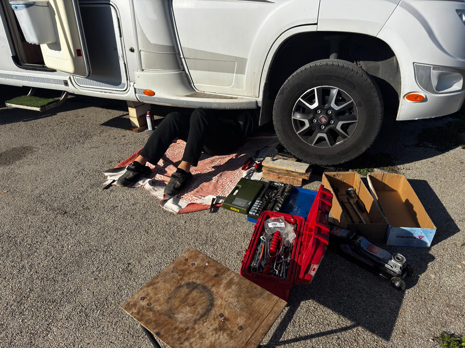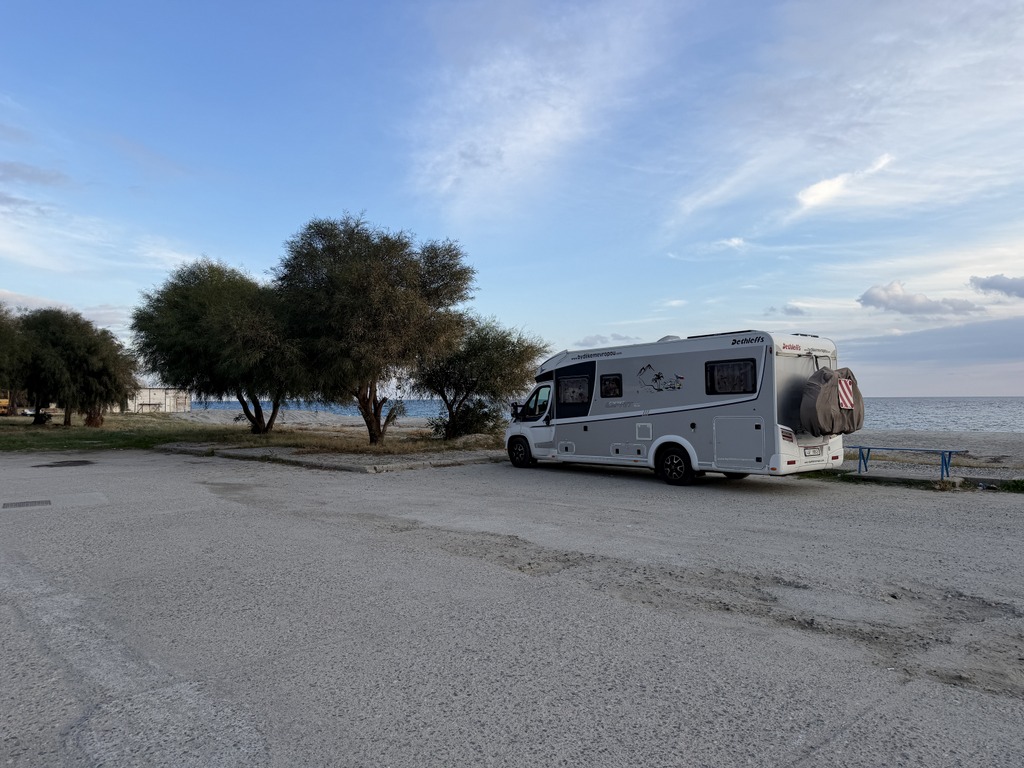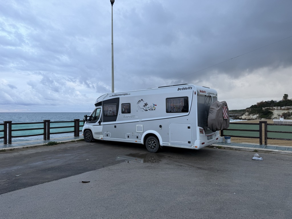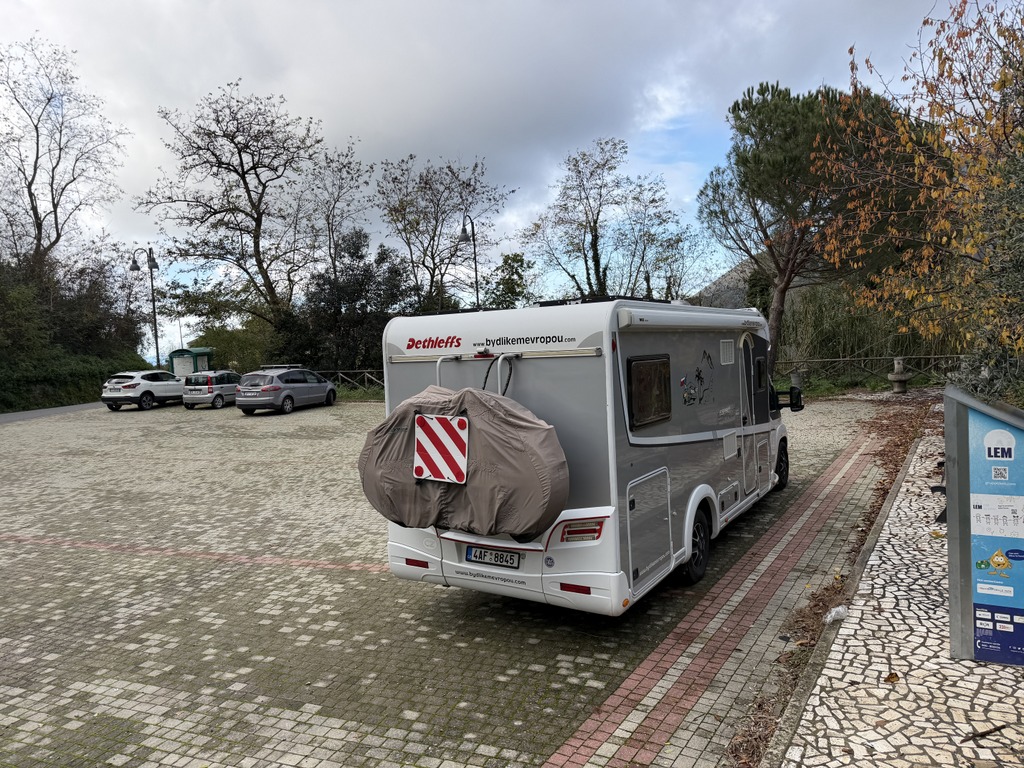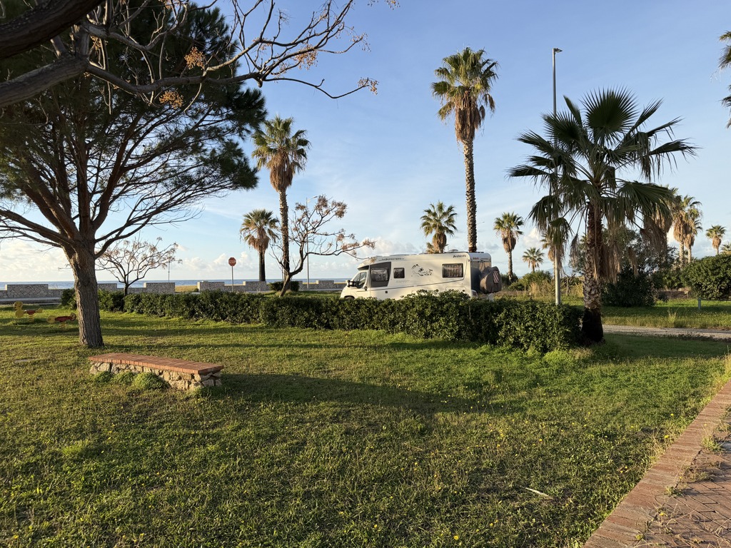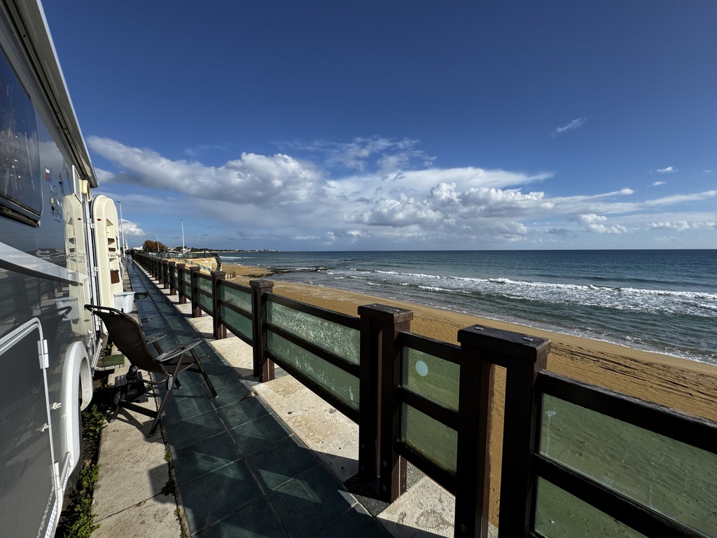 Stojíme na klasickém parkovišti v Agropoli hned u kanálu, který stahuje vodu z hor nad námi. První, co jsem koukala, jak jsme vysoko nad potůčkem, který se umí změnit v dravou řeku během jedné noci. Na to bych upozornila při stání na divoko pod horami u malého potůčku. U nás ani nemusí pršet, ale prší v horách a k nám se to vše přižene. Během pár hodin se může zvednout hladina potůčku i o několik metrů. To už se nám taky stalo a rozhodně bych to znovu zažít nechtěla.