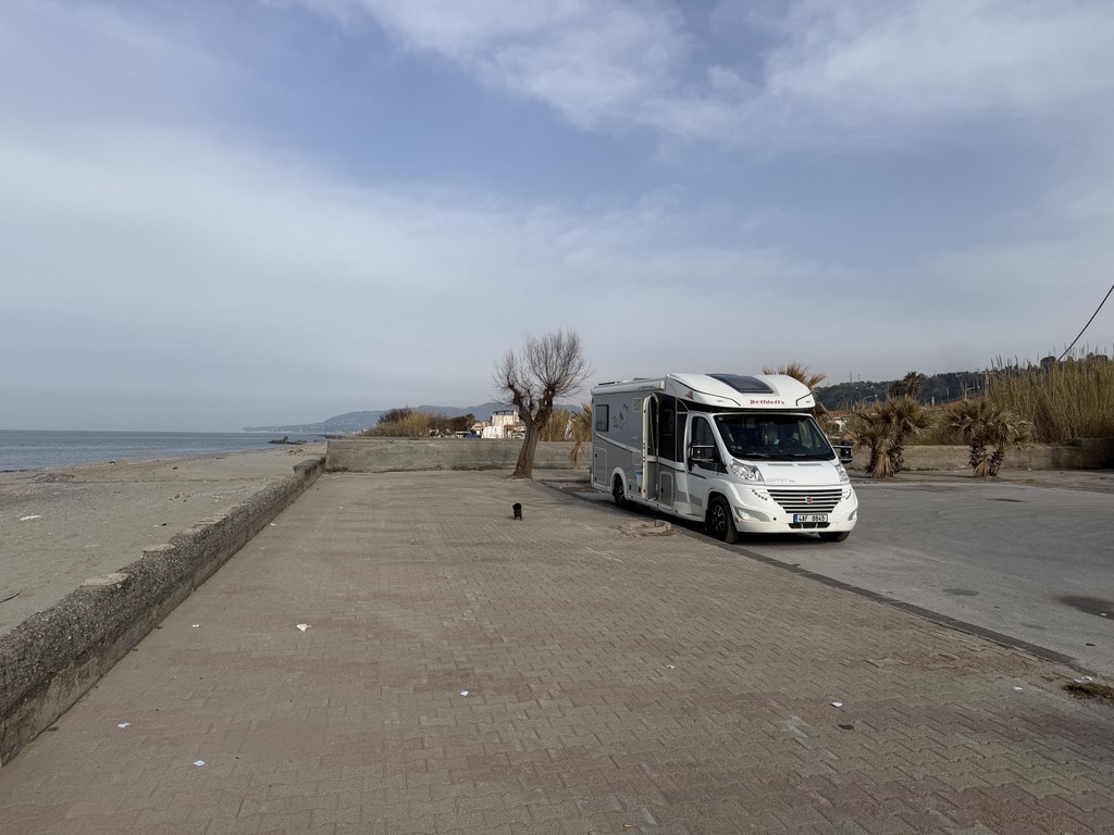 Kus pobřeží vzala bouře Harry. Zdenda měl naplánované místo, kde už jsme stáli, ale bohužel. Musíme vzít zavděk náhradním parkovištěm.