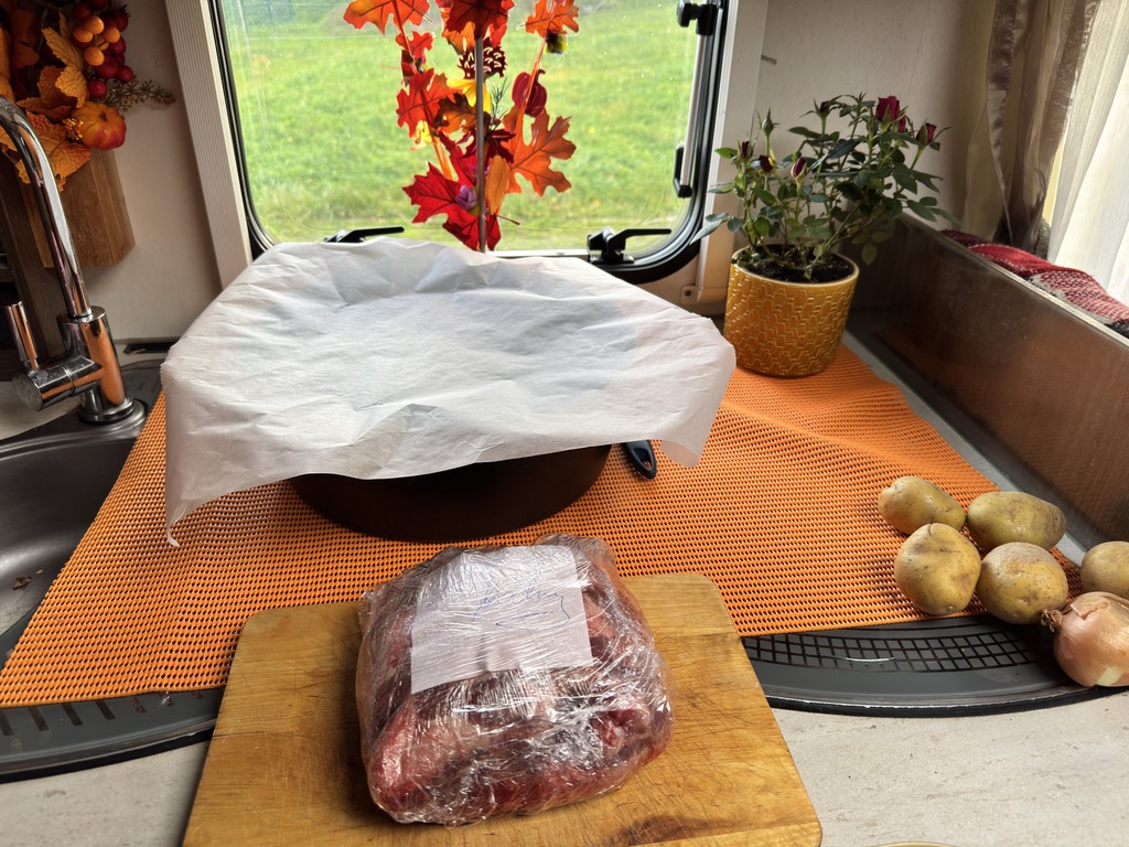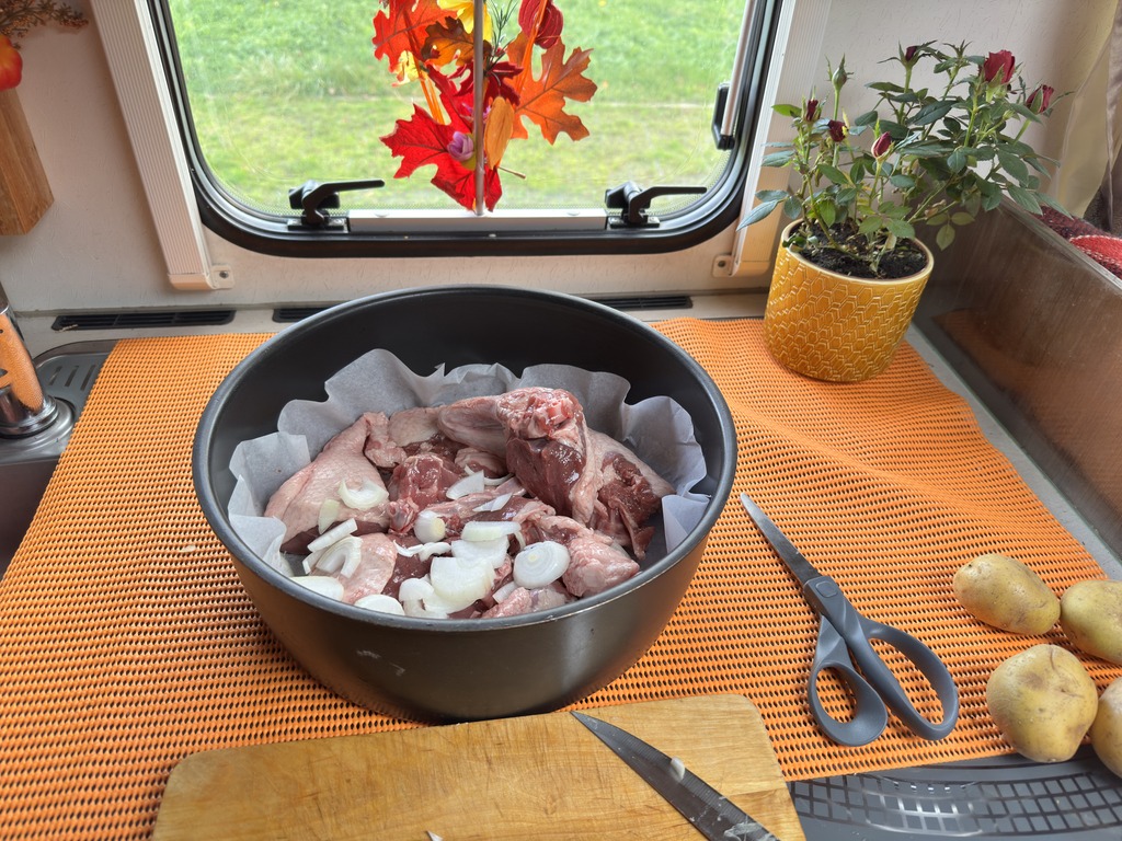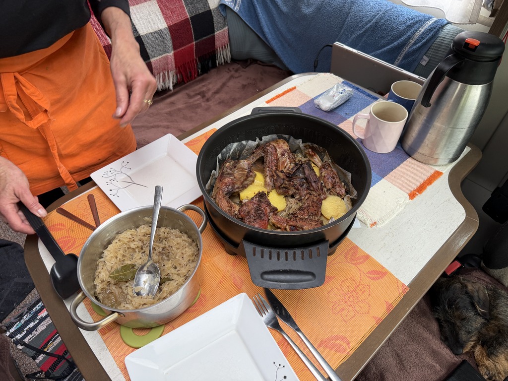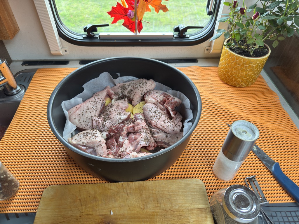 Mám s sebou zásoby ještě z domova a dneska jsem zalovila v mrazáku, teda vlastně včera večer, a vytáhla balíček s půlkou kachny.