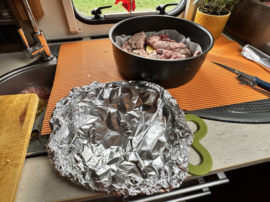 Brambory a cibule jde pod kačenu. Tu řádně posolím a hlavně pokmínuji. Klasika. Nic víc. Pokud chci něco hodně propéct, což v případě kačenky ano, tak si vyrobím takovou alobalovou pukličku, kterou položím na maso a půl hodiny peču pod pukličkou.