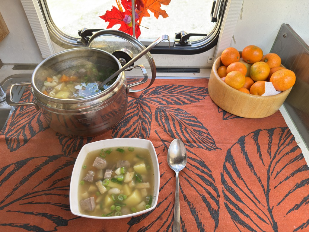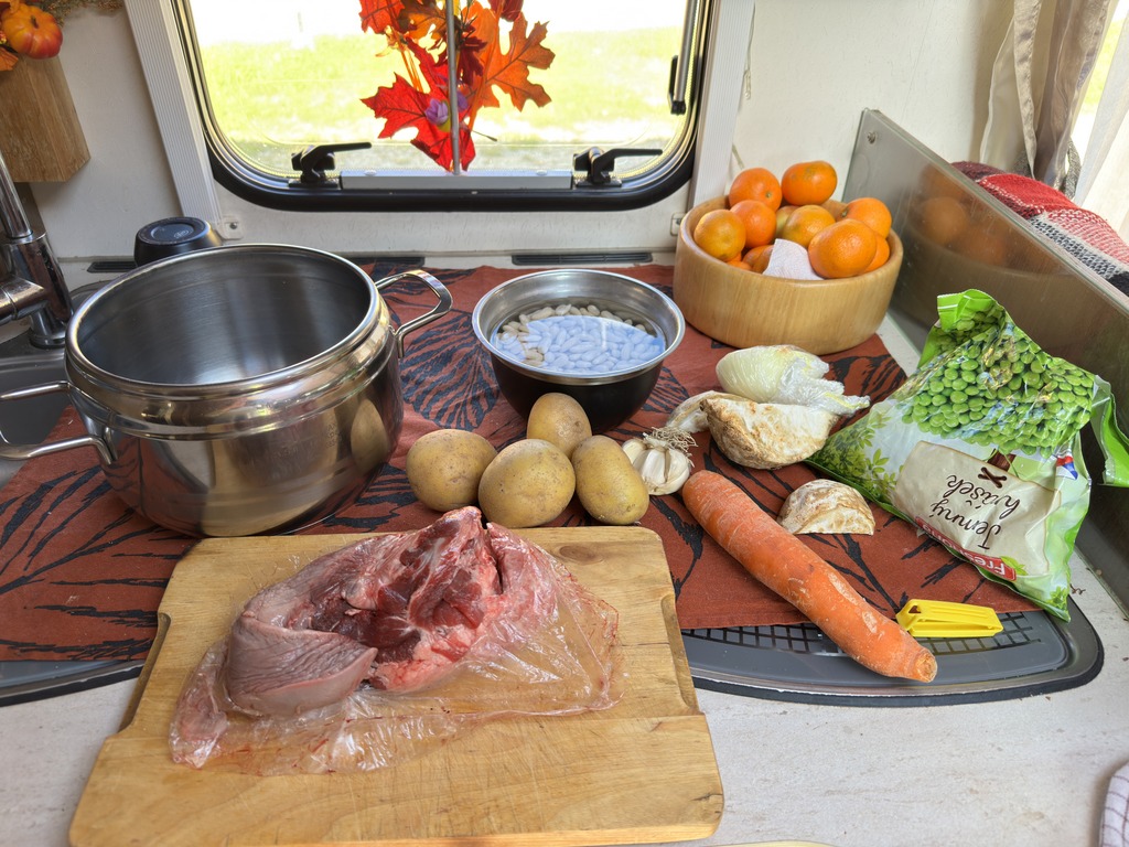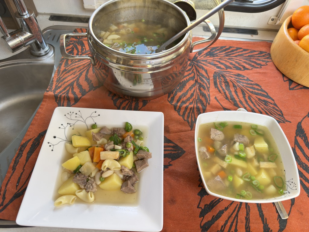 Já jsem měla v mrazáku jeden vepřový jazyk, ten jsem uvařila a do vývaru jsem nasypala podle jednoho z mnoha receptů nahrubo nakrájené brambory, mrkev, celer, česnek a na větší kousky nakrájený očištěný a už uvařený vepřový jazyk. Fazole den namočené sleju, propláchnu a dám je do polévky až jsou brambory skoro uvařené.