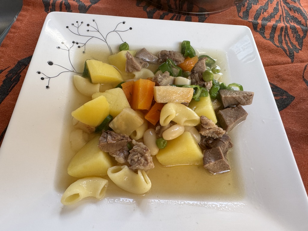 Nakonec hrášek a těstoviny, ale ne moc a něco zeleného. Zelenou cibulku, petrželku, celerovou nať. Asi bych to přirovnala k německému eintopf, jídlo z jednoho hrnce.