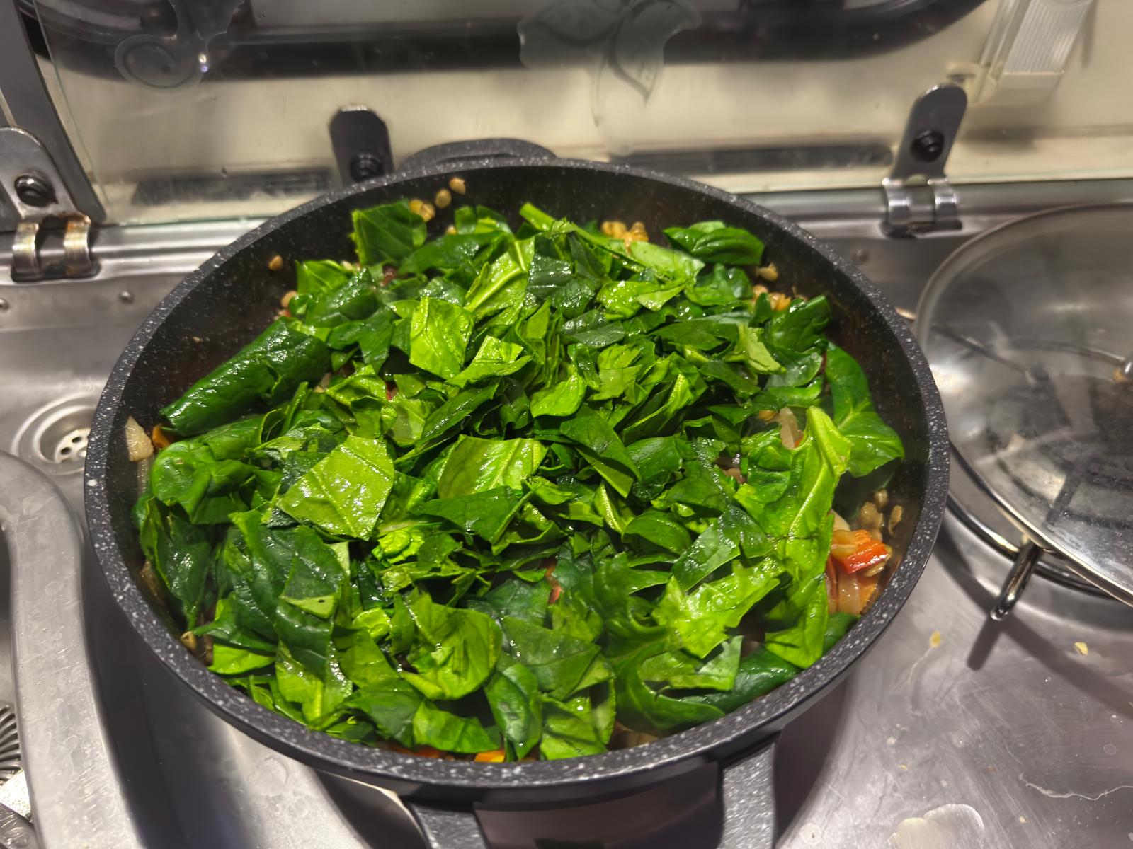 Jakmile čočka začne měknout přidáme mísu čerstvého špenátu, a ještě chvíli dusíme. Špenát se neuvěřitelně smrskne, takže ho můžeme dát opravdu hodně.