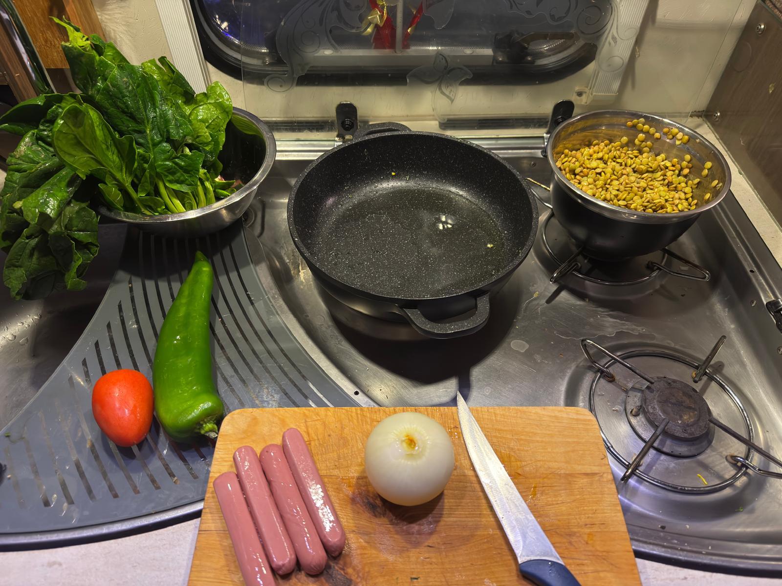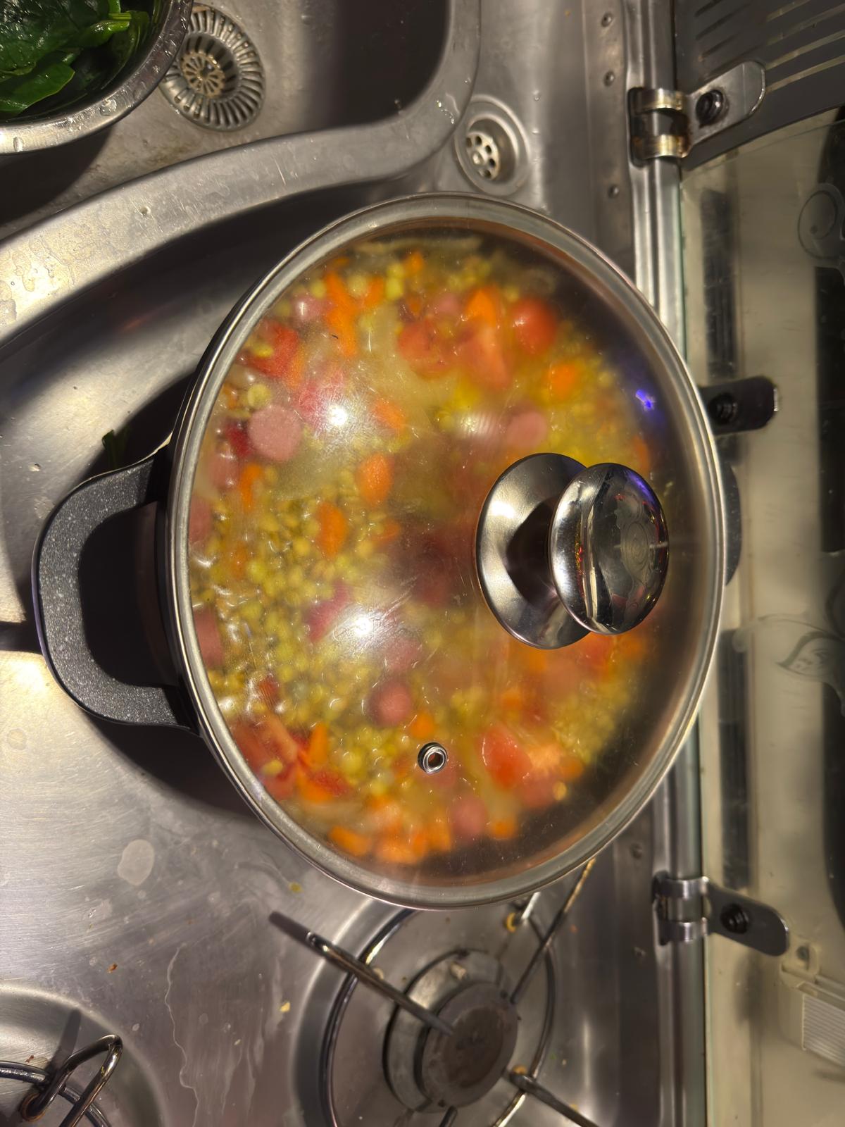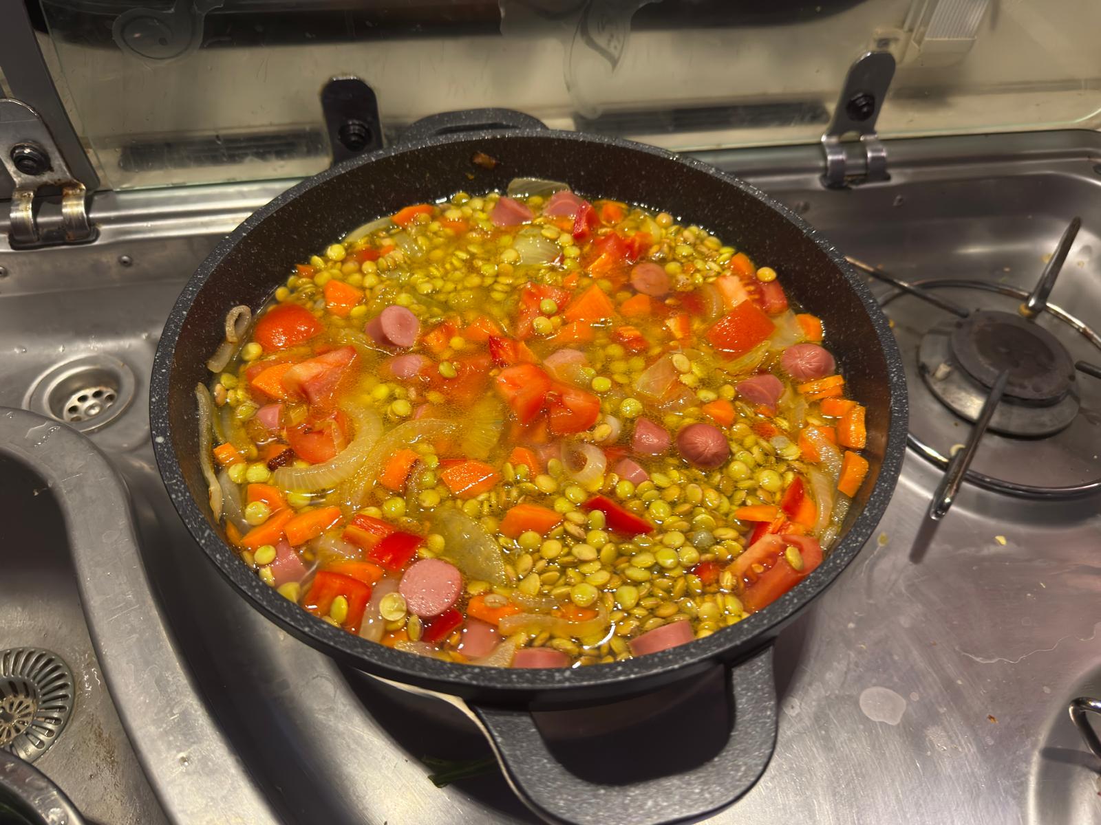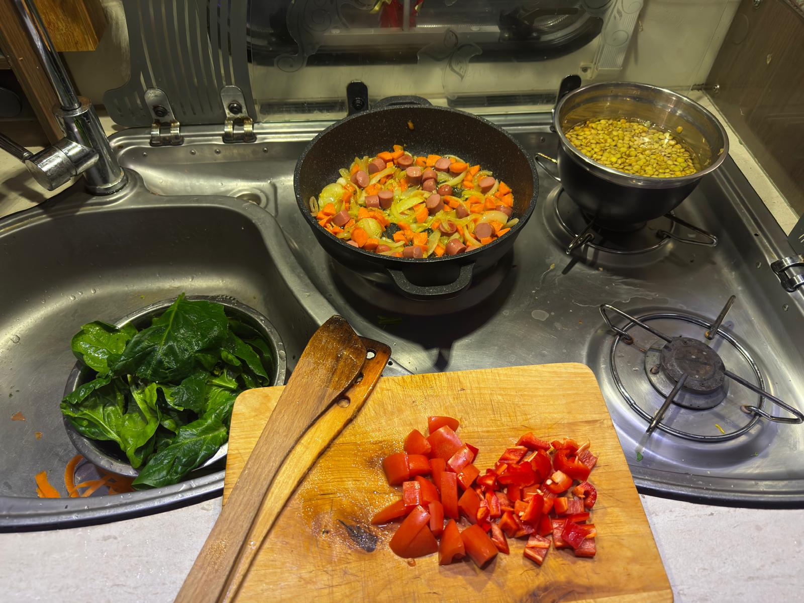 Čočka + mrkev + párky + cibule + paprika + rajče + olej + čerstvý špenát + sůl, pepř.