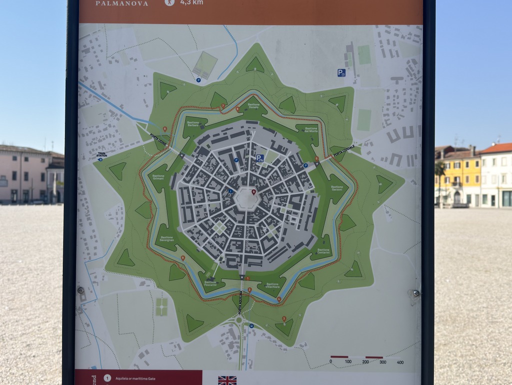 Dalším městem je poměrně velké opevněné město Město ve tvaru devíticípé hvězdy: hvězdné město Palmanova.