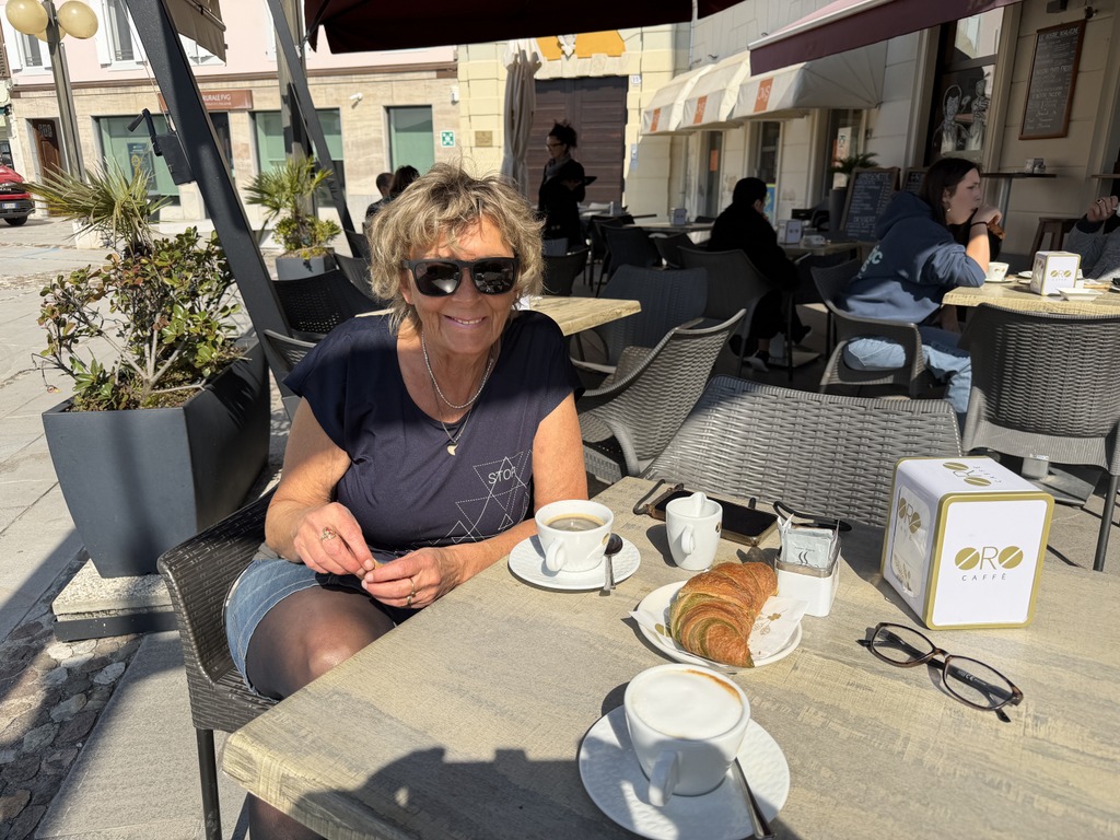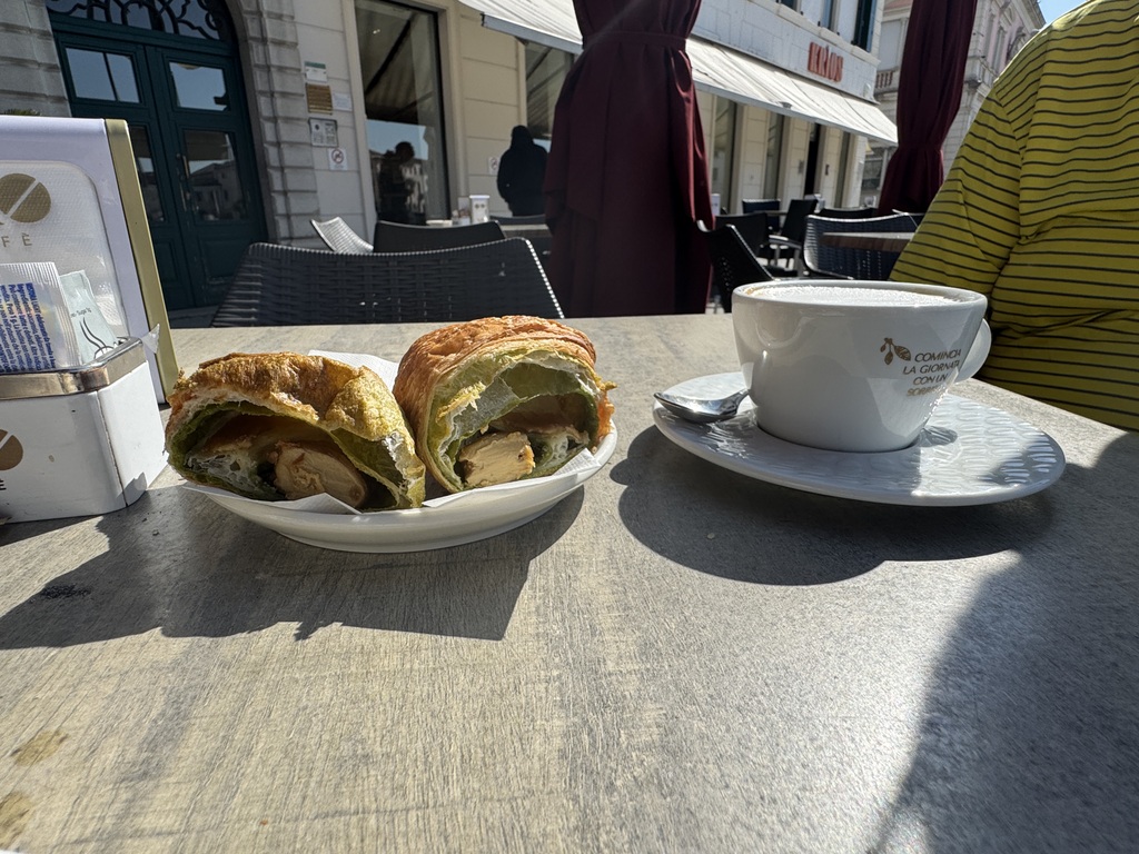 Dneska jsme si dali Italskou specialitu, a to pistáciový croissant. Je to dobrota, ale příšerně sladká. Pistáciový krém je jednak v jednotlivých vrstvách, ale celý je zabalen kolem velkého kusu tuhé hmoty plné pistácií a tuhého krému.
